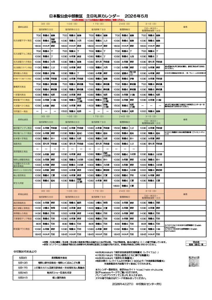 礼拝カレンダー5月号が完成しましたのでお知らせいたします。修正等ありましたら中部教区センターまでお知らせください。