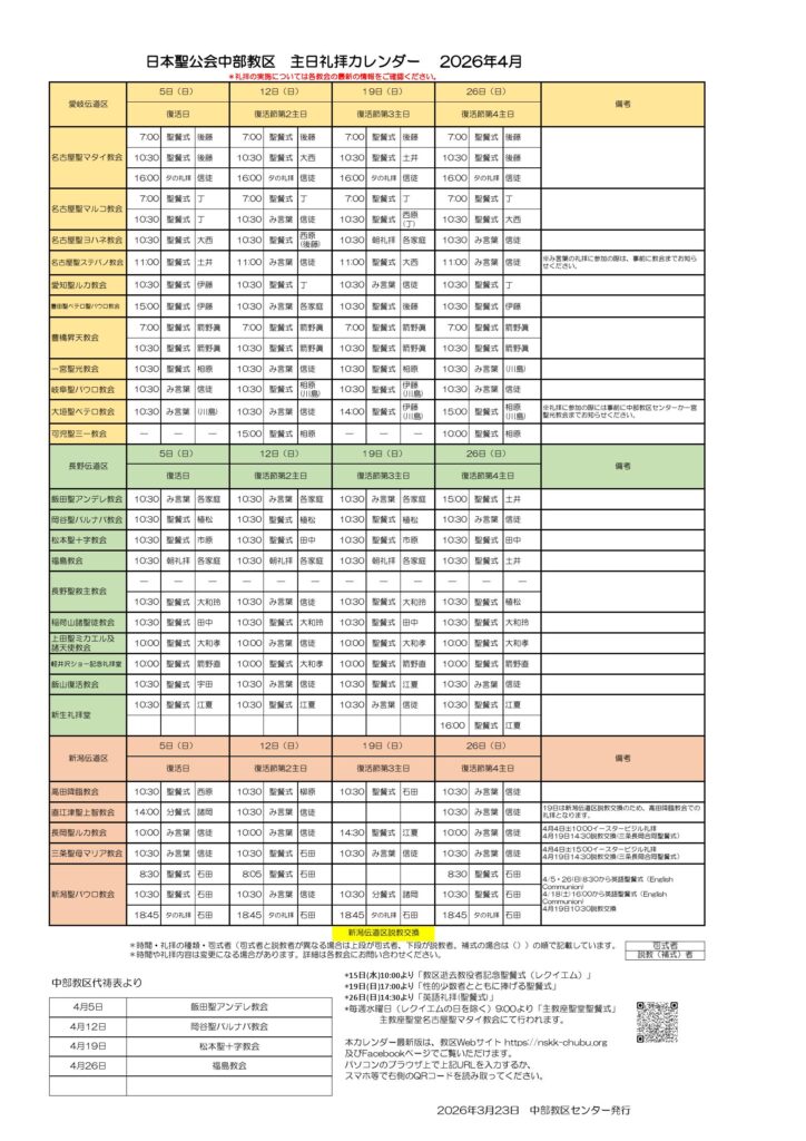 今年も各教区(横浜・京都・大阪・中部)の代祷表を掲載し、お知らせいたします。