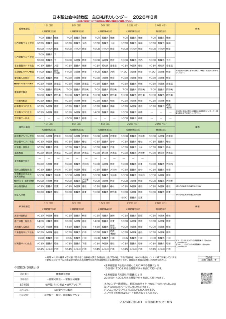 2/27修正…長野:3/8(み言葉→聖餐式)、3/29(み言葉→聖餐式)に修正しました。
